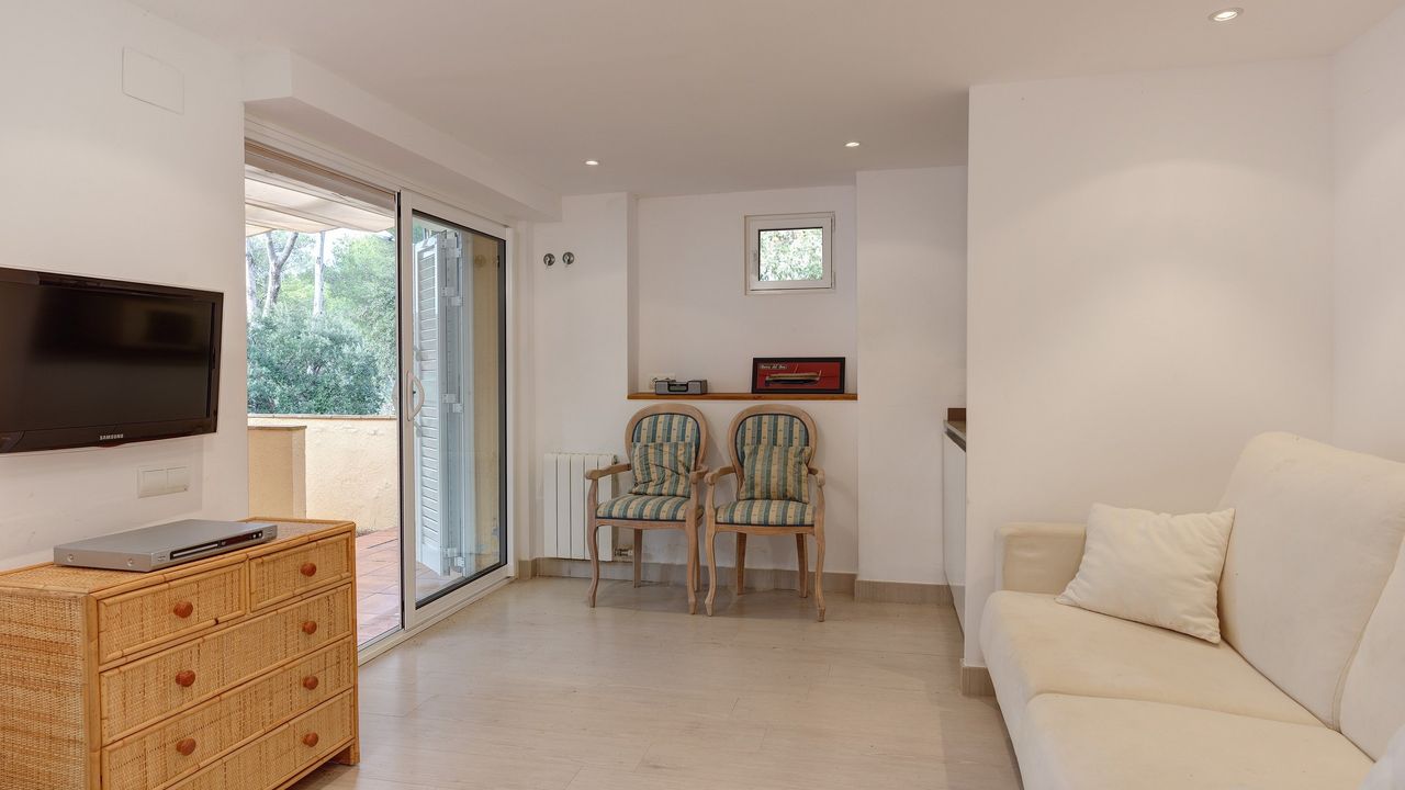 На нижнем этаже, на уровне улицы, имеется гараж (площадью 27 м2) и главный вход в дом. Здесь располагается полностью независимая студия (площадью 20 м2) с небольшой кухней, диваном-кроватью для двух человек и ванной комнатой с душем. С этого этажа у нас есть прямой доступ к саду и бассейну, а также к большой и очень красивой террасе.