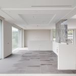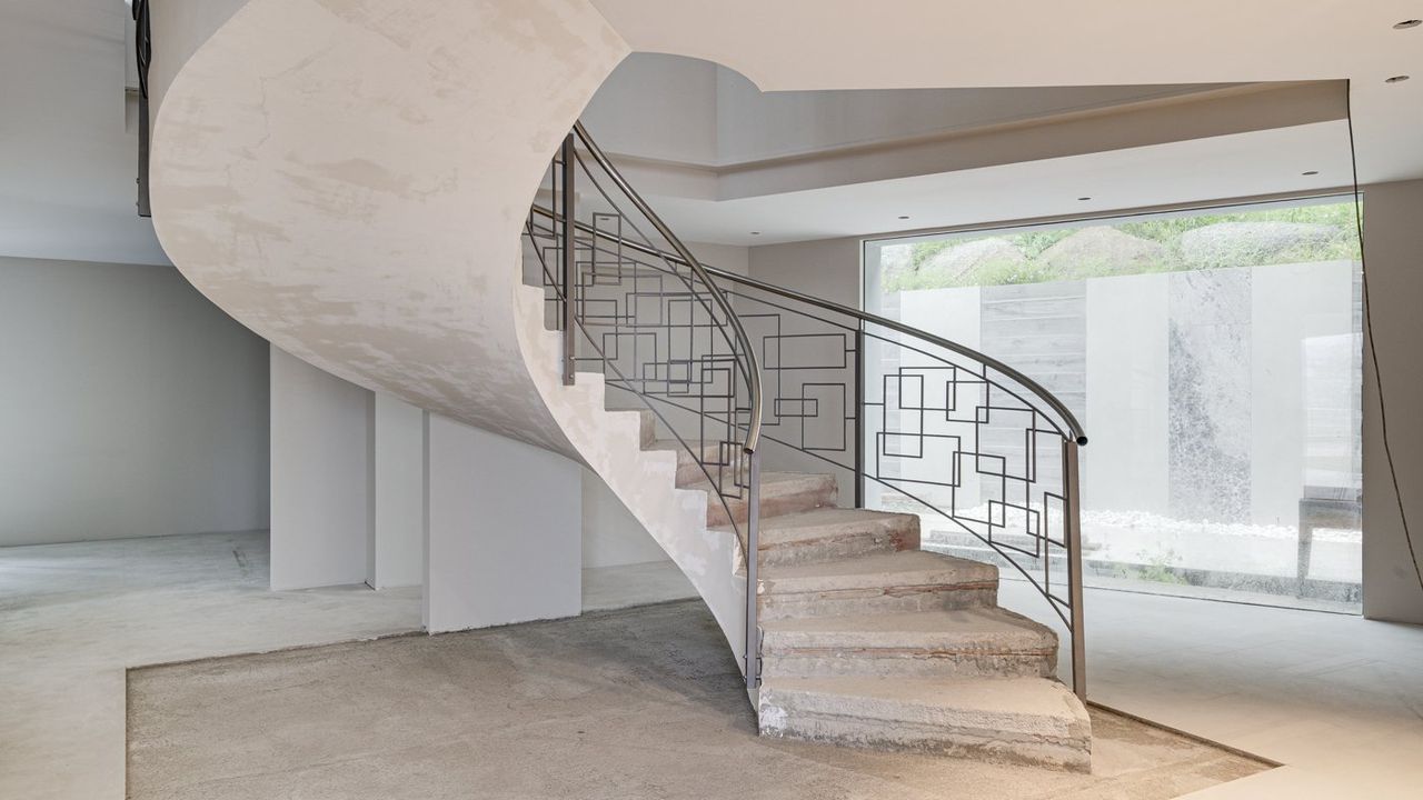 Первый этаж площадью 364 м2 предлагает просторное общественное пространство с гостиной, столовой двойной высоты, современной кухней, холлом с винтовой лестницей, гардеробной, ванными комнатами и отдельной зоной со спальнями с ванными комнатами.