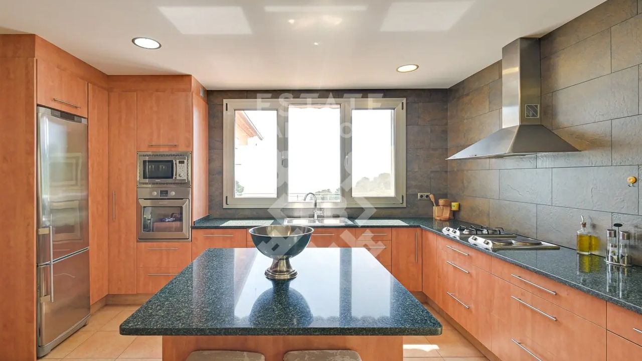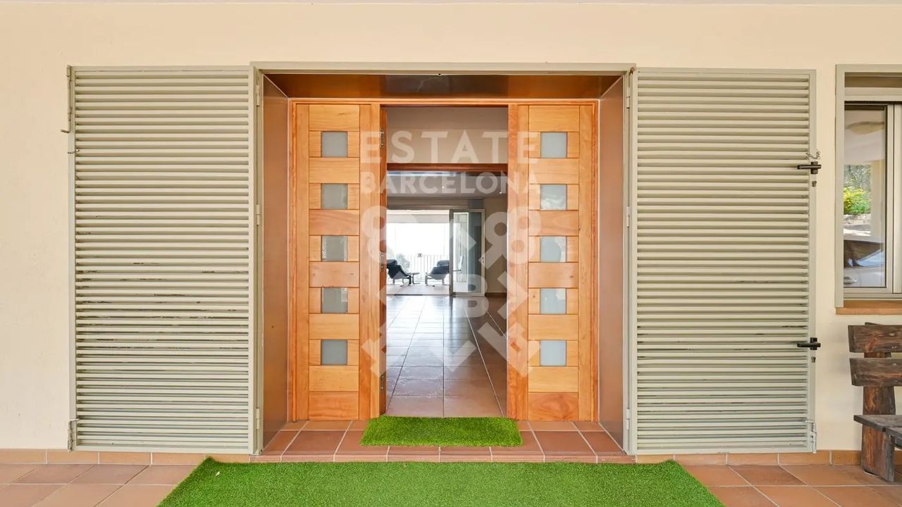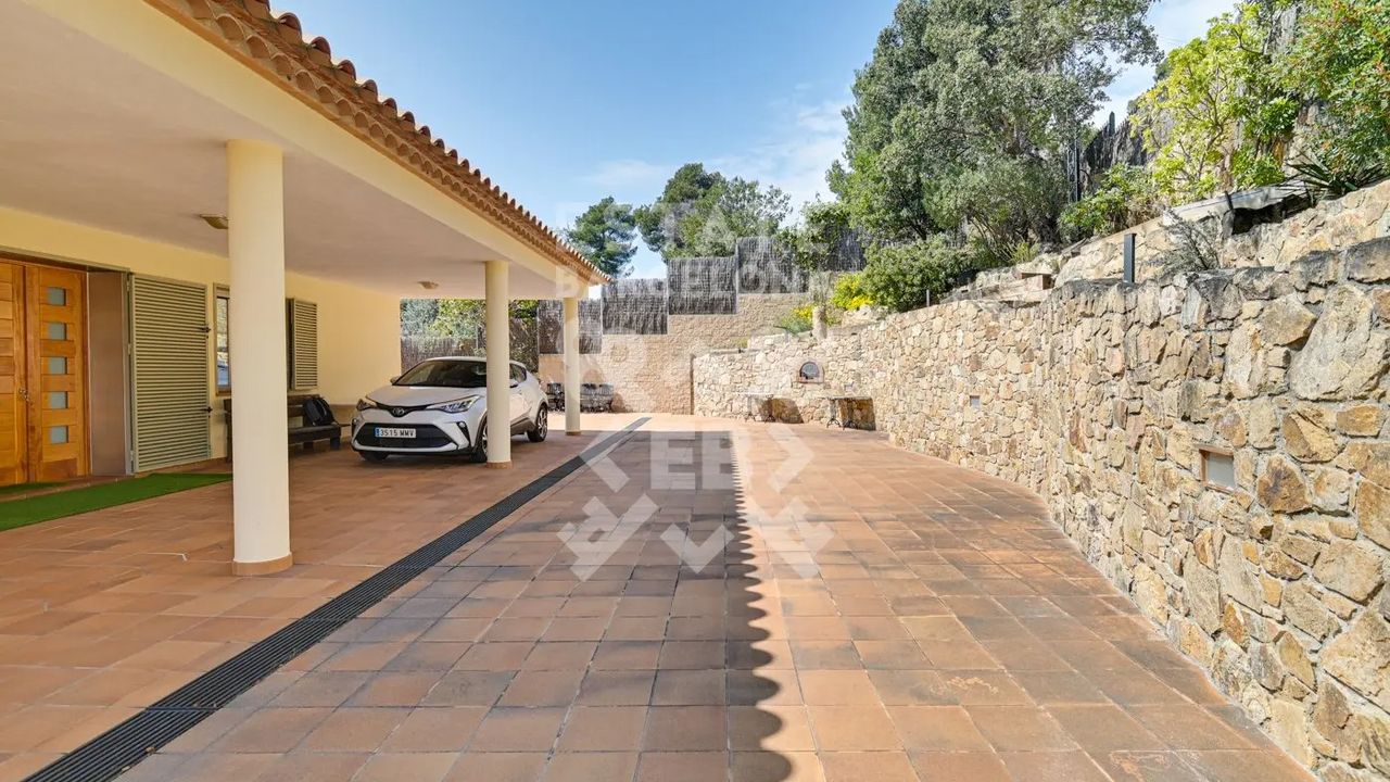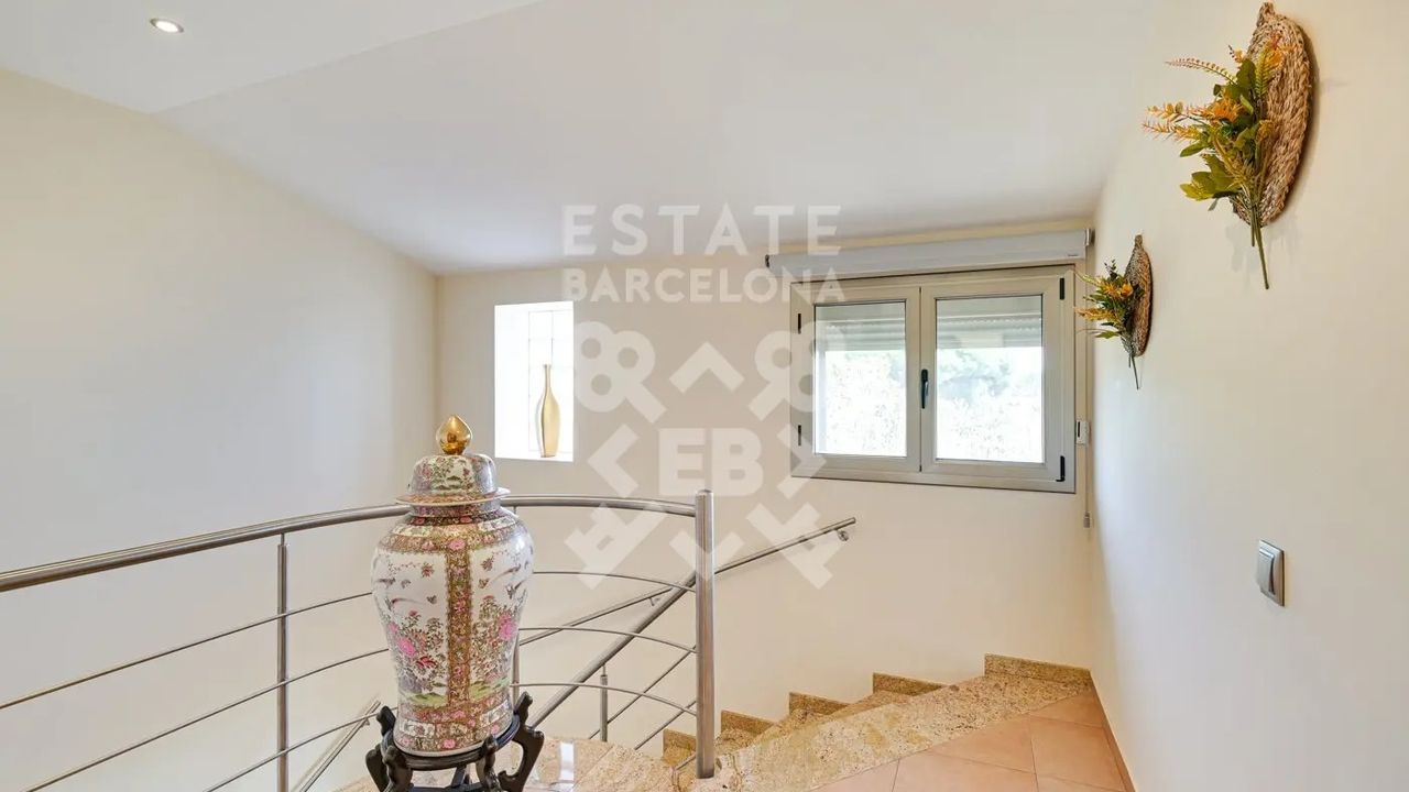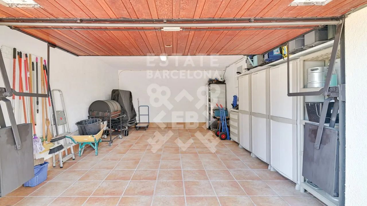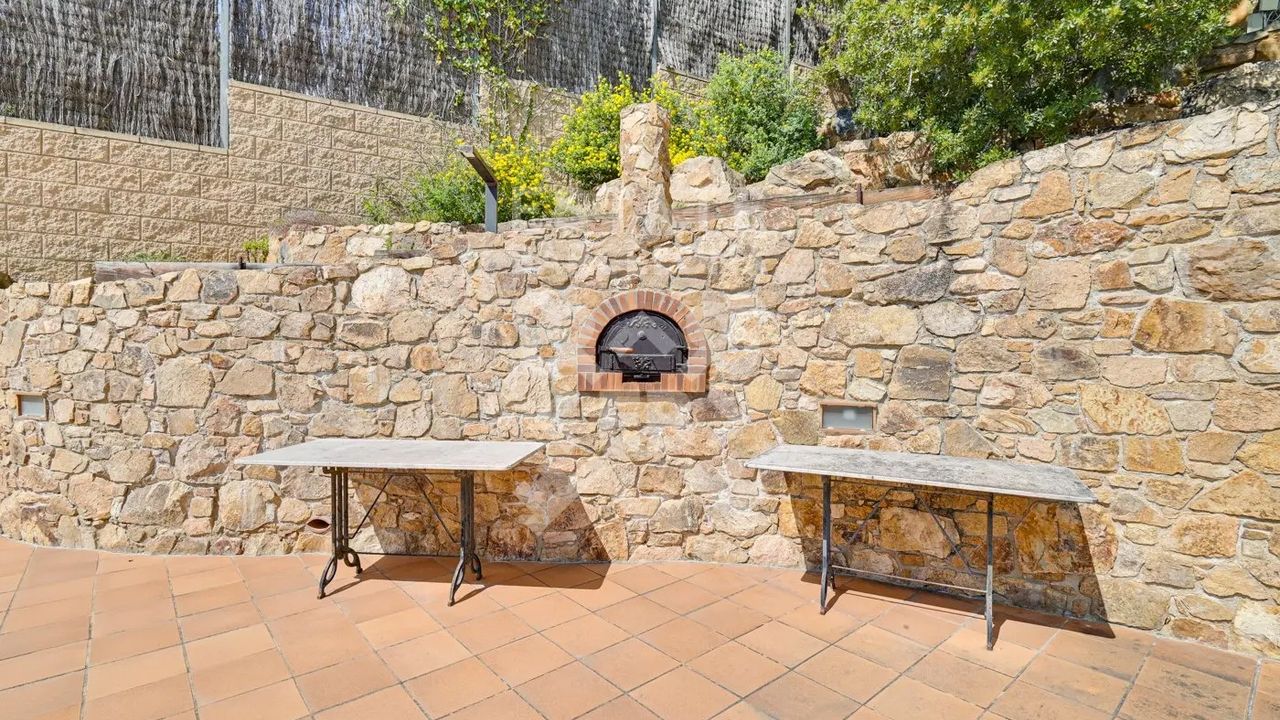 Мы выделяем такие детали, как ирригационная установка для всего сада, закрытый гараж, дровяная печь, раздевалка и полностью оборудованная ванная комната у бассейна, синие радиаторы отопления, окна с двойным остеклением, моторизованные жалюзи, оцинкованные железные решетки в стиле Майорки, дополнительный резервуар для питьевой воды.