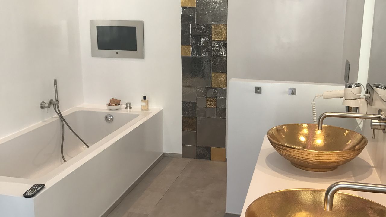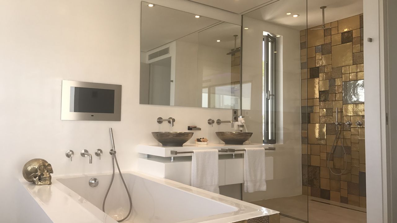 Каждая спальня со своей ванной комнатой площадью 25-30 кв. м. оборудована управляющей панелью и аудио-системой. В некоторых ванных комнатах установлены телевизоры, а из душа открывается вид на море.