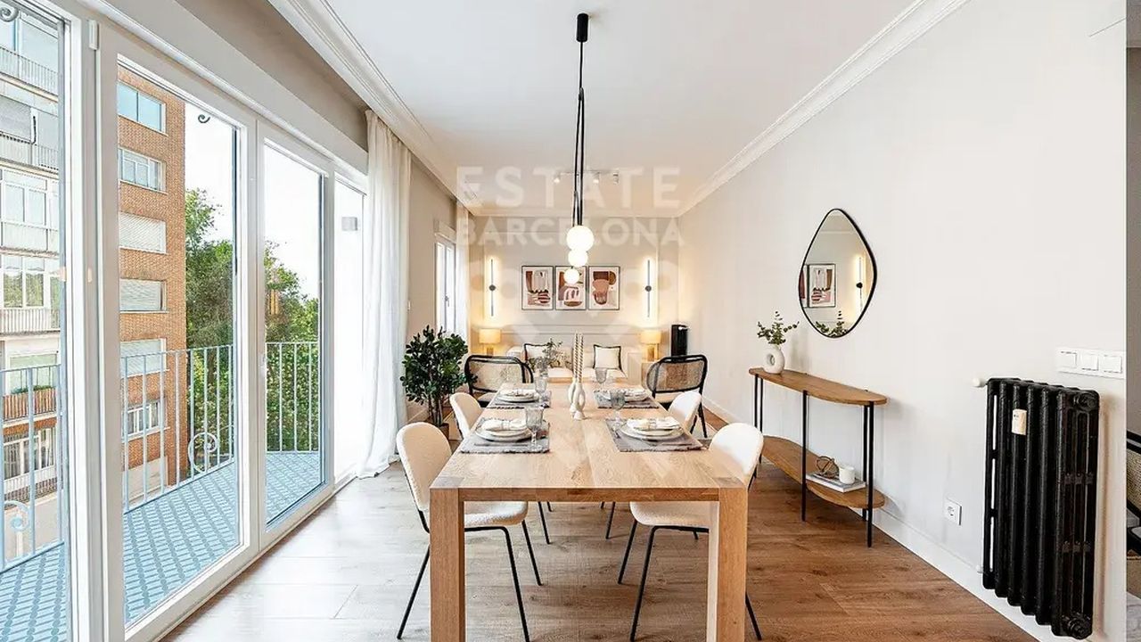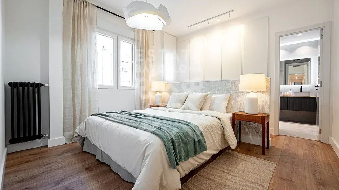 Большая столовая с выходом на террасу с открытым видом на Парк дель Оэсте и прекрасную гостиную. В приватную часть квартиры можно попасть через коридор: сначала комната со встроенными шкафами, выходящая на большой открытый внутренний дворик с видом на маяк Монклоа, а затем первая полностью оборудованная ванная комната, которая обслуживает 2 спальни.