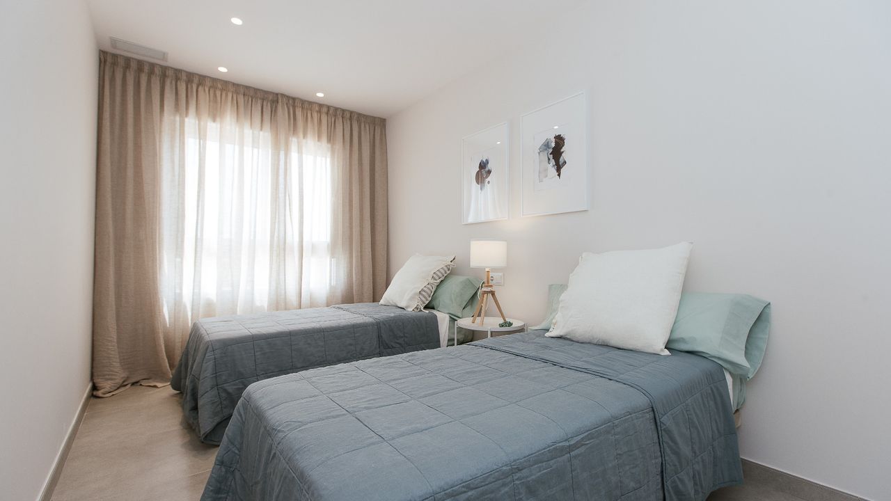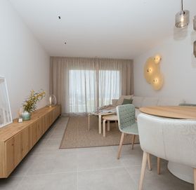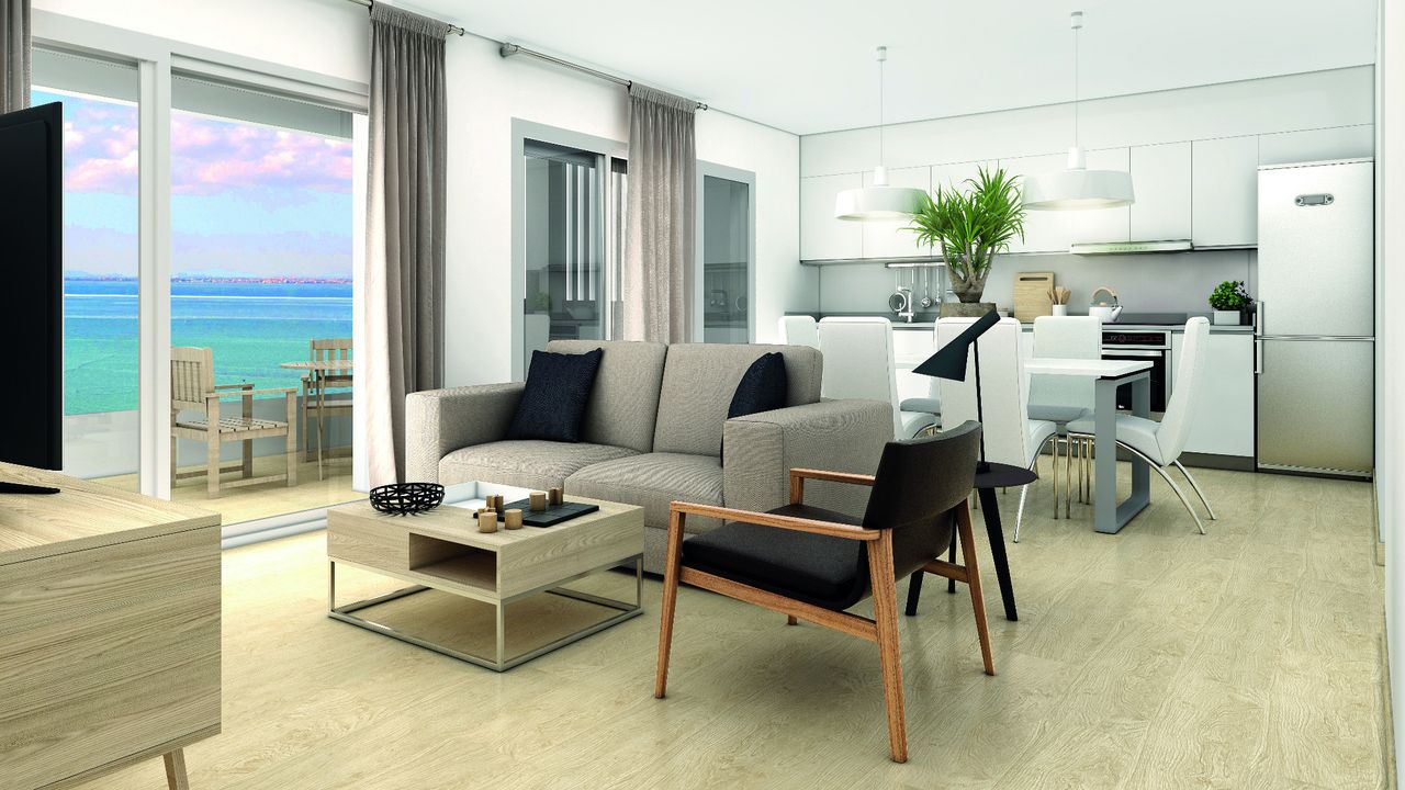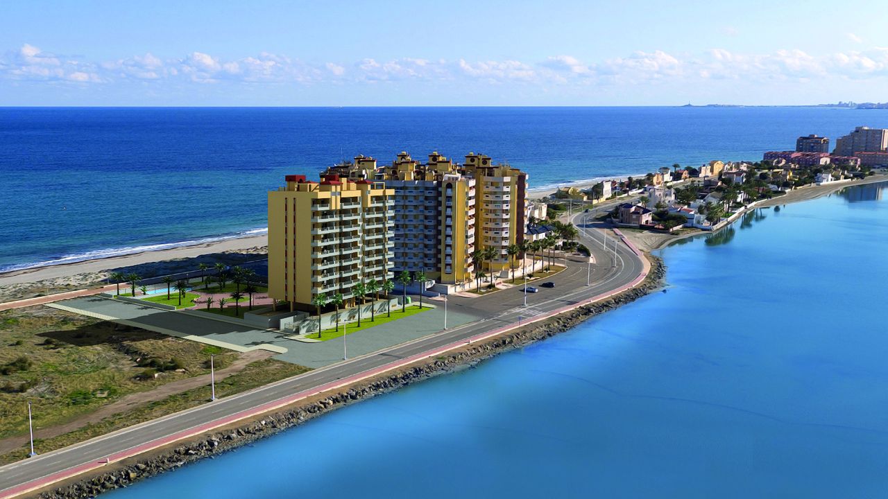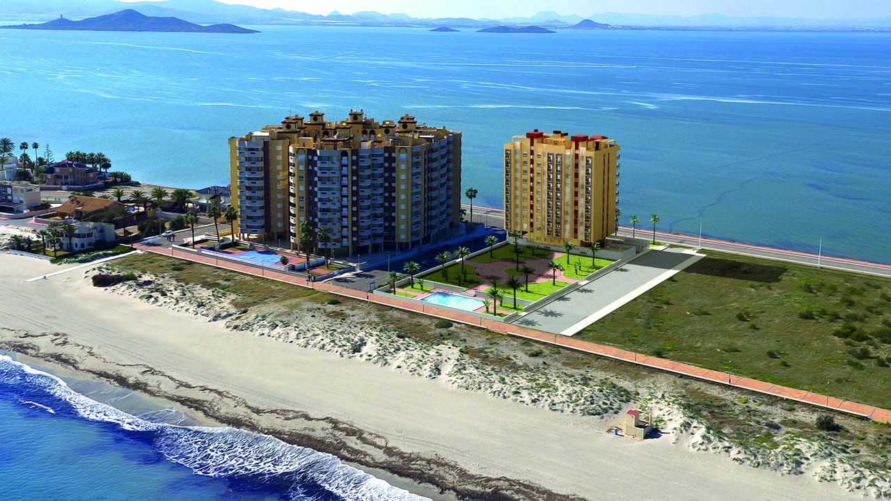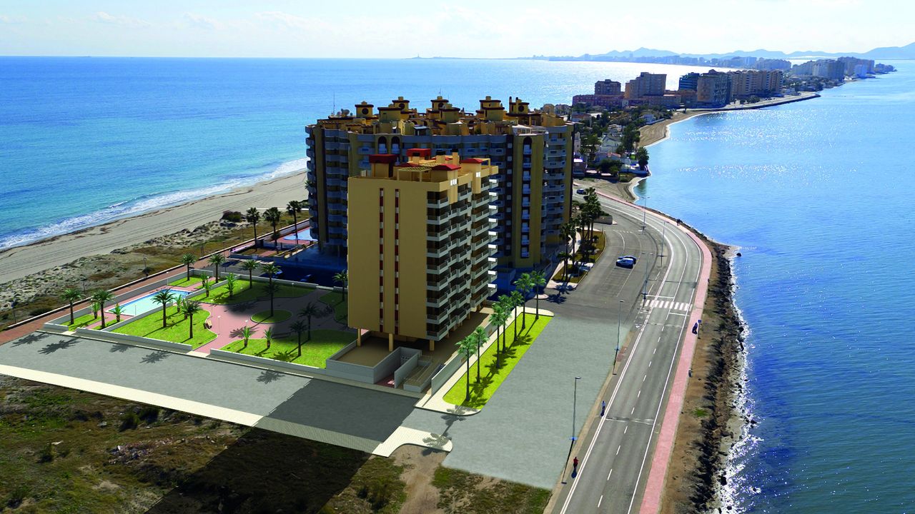 Superb Apartments New Construction in 1 ST SEA LINE at the Manga del Mar Menor! These apartments have an area of 90 m2 with 2 bedrooms and 2 bathrooms, an independent kitchen, a spacious living- and dining room extremely luminous. The apartments have a traverse view of the Mediterranean Sea on one side and the Mar Menor on the other side offering breathtaking views!! Ideal for its location, just 800 meters from the port of Tomás Maestre, where we will find a leisure area with bars, cafes, restaurants, shops, supermarkets, pharmacies, banks, etc. This residence has 45 magnificent apartments where you can enjoy the magnificent sunsets on the sea from your terrace. Included in the price: ceramic hob, electric oven and extractor hood Prices from 152.000 Euros to 180.000 Euros. Posibility for garage from 14.000 Euros. Counts with SHOW HOUSE FOR VISITING.