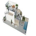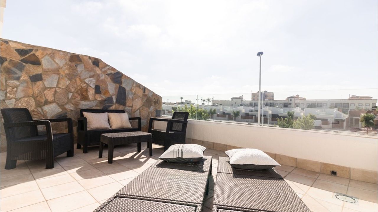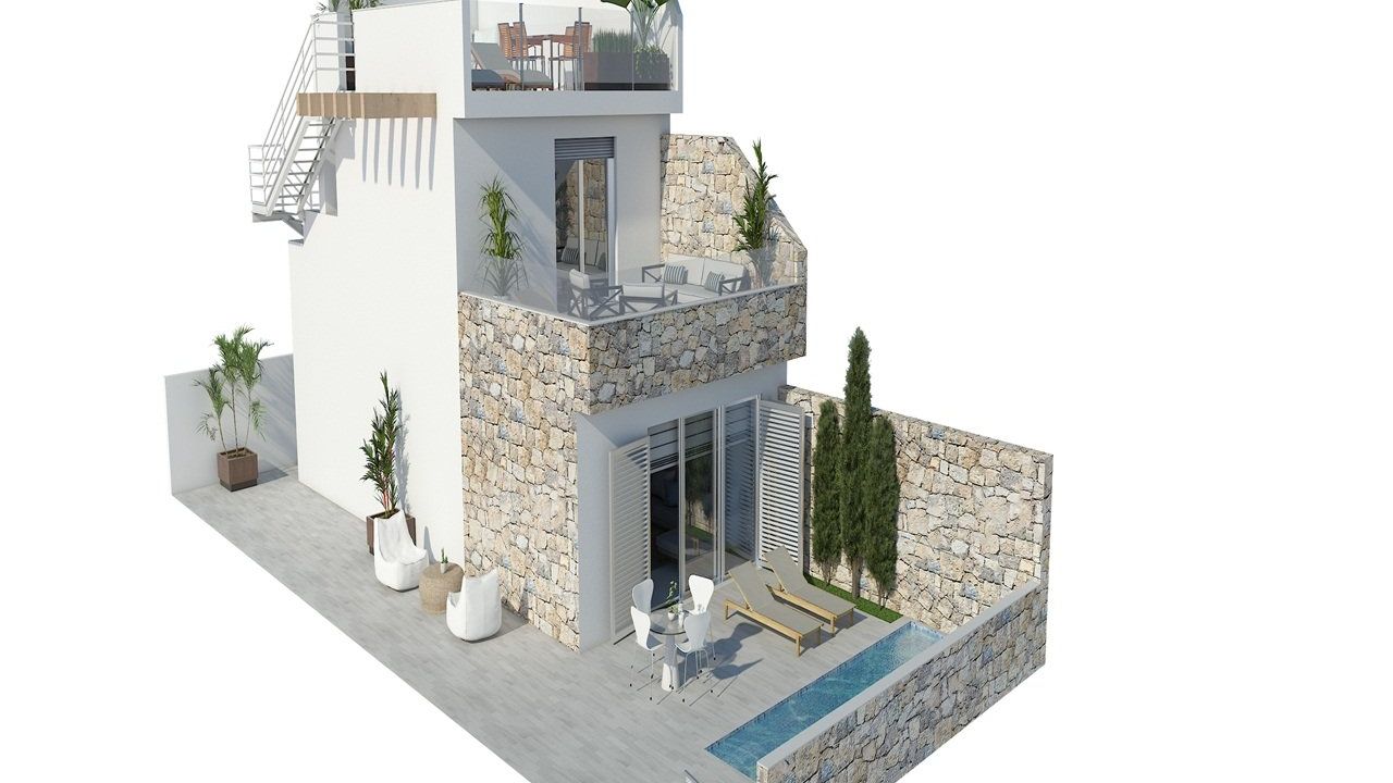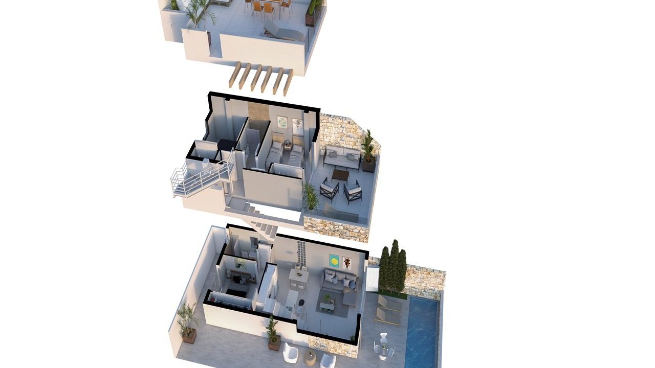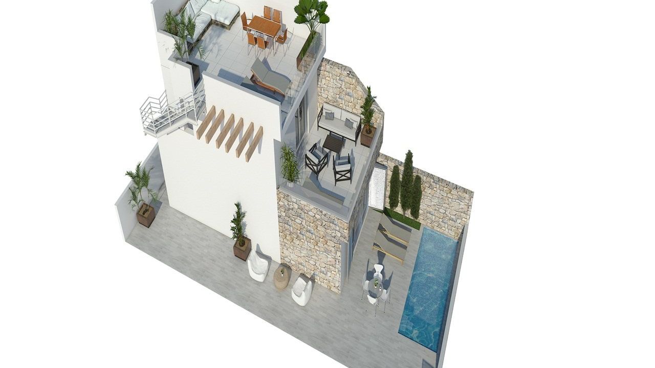 2-х этажная вилла в Лос-Алькасарес, Мар-Менор. Салон, американская кухня, 3 спальни, 2 ванные комнаты, терраса, солярий. Общая площадь 129 м2. На участке в 123 м2 есть частный бассейн, гараж и складское помещение.