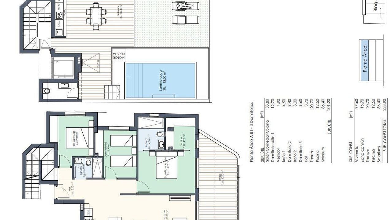 В квартире общая площадь 233 кв. м, есть три спальни, две ванные комнаты, просторная гостиная с кухней, терраса 21 кв. м и солярий (терраса 86 кв. м на крыше, где можно загорать, плавать в бассейне, барбекю и наслаждаться видом на окрестности.)