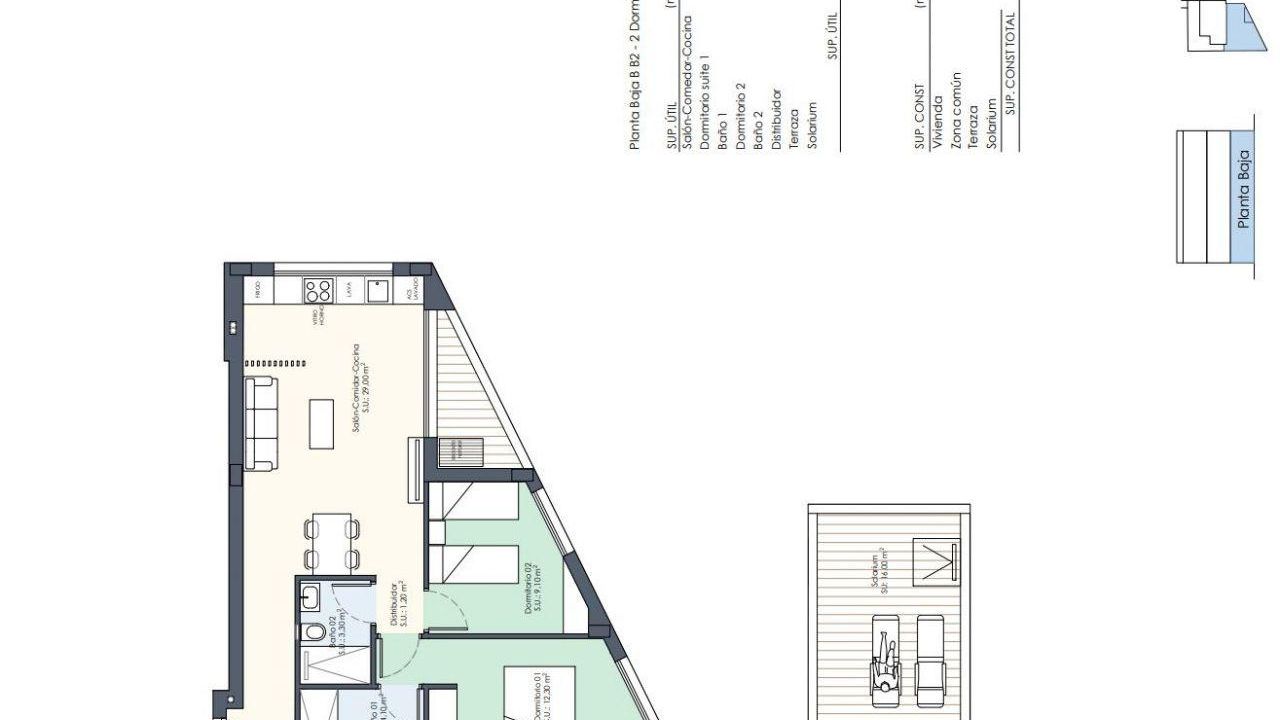 В квартире общая площадь 106 кв.м., две спальни, две ванные комнаты, просторная гостиная с кухней, терраса 3 кв.м. м и солярий (терраса 16 кв. м на крыше, где можно загорать. барбекю, наслаждаться видом на окрестности.)