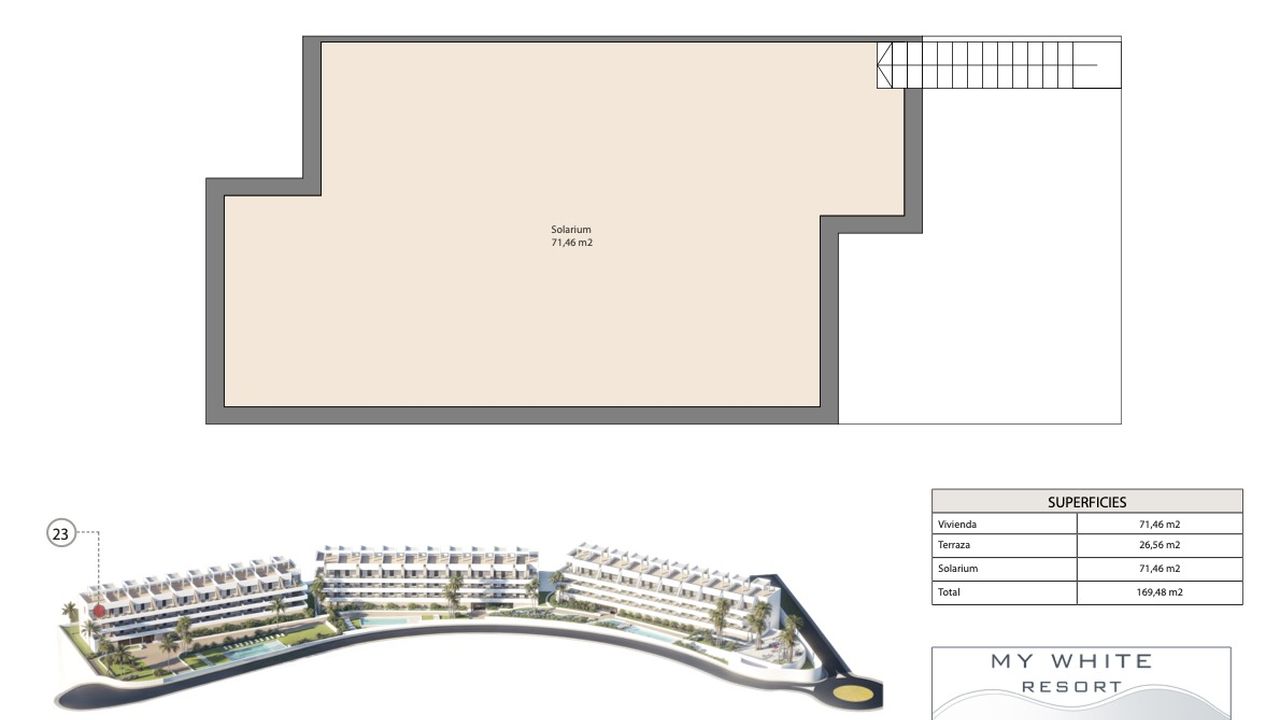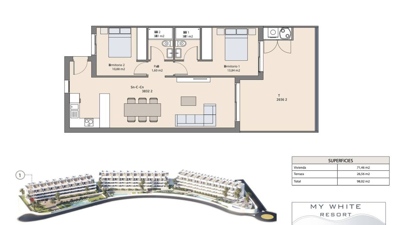 My White Resort жилой комплекс с 3 большими бассейнами, детской площадкой, крытым и открытым тренажерным залом, расположенный в нескольких минутах езды от лучших пляжей северного побережья Коста-Бланки, а также от центра города Бенидорм, и одного из лучших отелей в Европе (Asia Gardens). Кроме того, My White Resort имеет доступ к торговым центрам, школам, государственным и частным больницам, а также ключевым транспортным сообщениям, включая высокоскоростной поезд и международный аэропорт Аликанте, расположенный всего в 30 минутах езды.