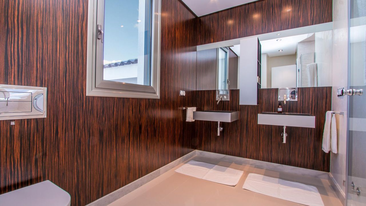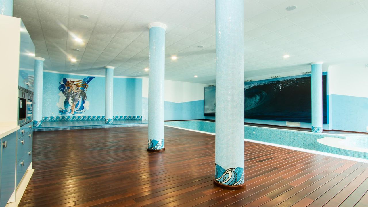 На нижнем уровне крытый бассейн и спа-зона с джакузи, сауной, парной, барной зоной, кухней и туалетом, а также отдельные помещения для персонала, состоящие из гостиной, столовой открытой планировки, кухни с отдельной спальней и ванной комнатой.