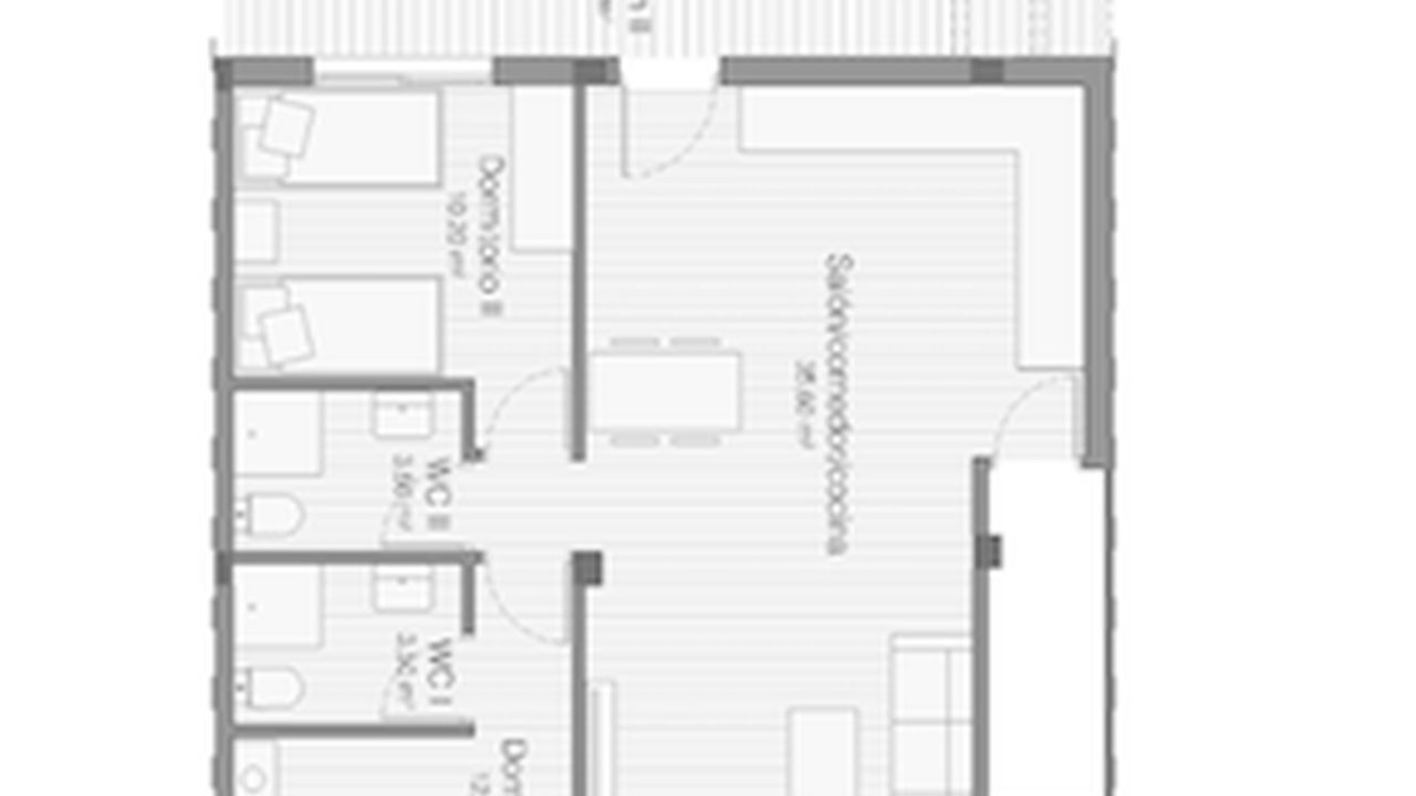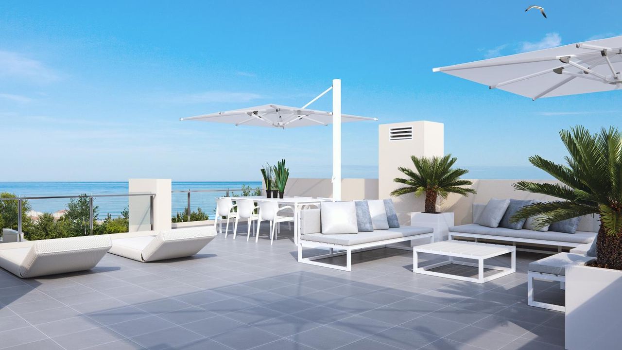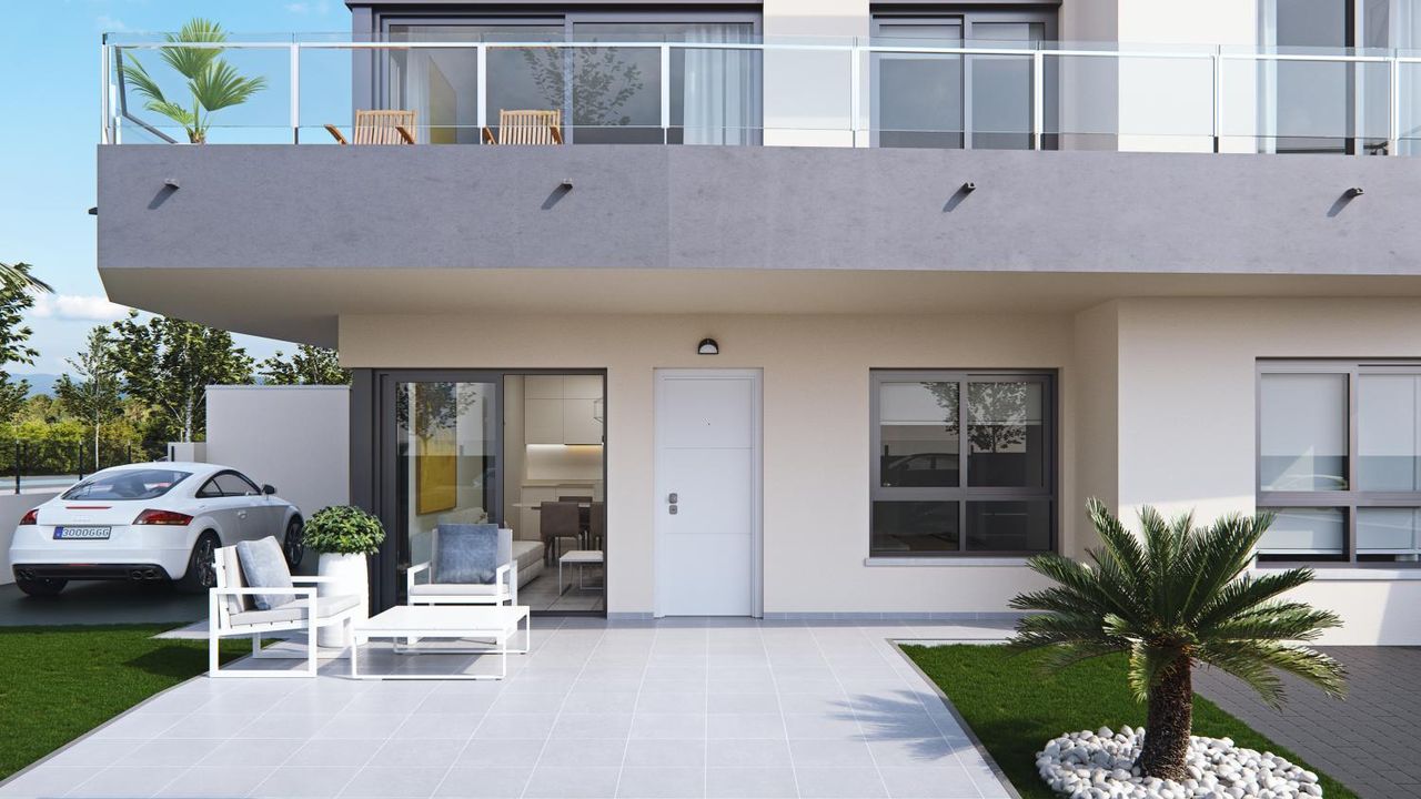 Квартира на первом этаже имеют гостиную с выходом на террасу, кухню совмещенную с гостиной 36 м2 , две спальни 12,3 и 10,2 м2 и 2 ванные комнаты по 3,5 М2, собственный сад общая площадь 102 м2.