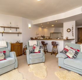 Салон с камином, американская кухня, 2 спальни, 1 ванная комната, из салона и одной из спален выход на террасу площадью 16 м2, винтовая лестница с террасы ведет в частный солярий площадью 35 м2. При строительстве применены материалы высокого качества.