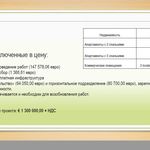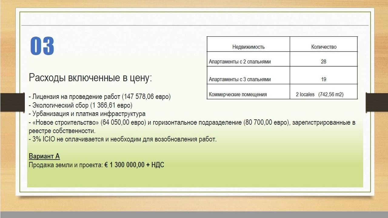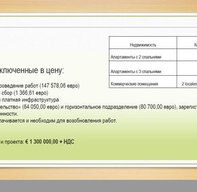 Продажа полностью завершенного проекта (под ключ): 6 000 000 € + НДС. Стоимость строительства 800 € / м2, включая архитектурные сборы, лицензии,