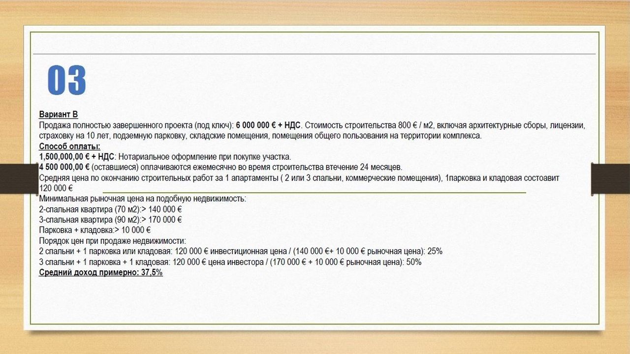 3 спальни + 1 парковка + 1 кладовая: 120 000 € цена инвестора / (170 000 € + 10 000 € рыночная цена): 50%