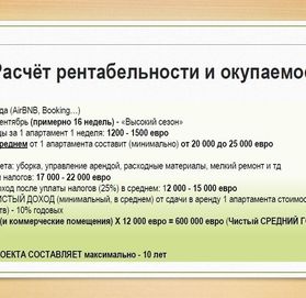 - 12 -15 000 евро ЧИСТЫЙ ДОХОД (минимальный, в среднем) от сдачи в аренду 1 апартамента стоимостью 120 000 евро
