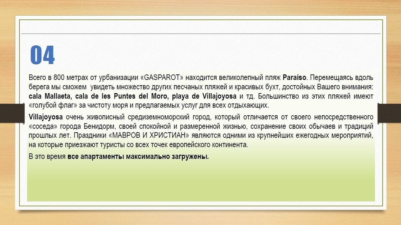 Villajoyosa очень живописный средиземноморский город, который отличается от своего непосредственного «соседа» города Бенидорм, своей спокойной и размеренной жизнью, сохранение своих обычаев и традиций прошлых лет. Праздники «МАВРОВ И ХРИСТИАН» являются одними из крупнейших ежегодных мероприятий, на которые приезжают туристы со всех точек европейского континента.