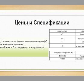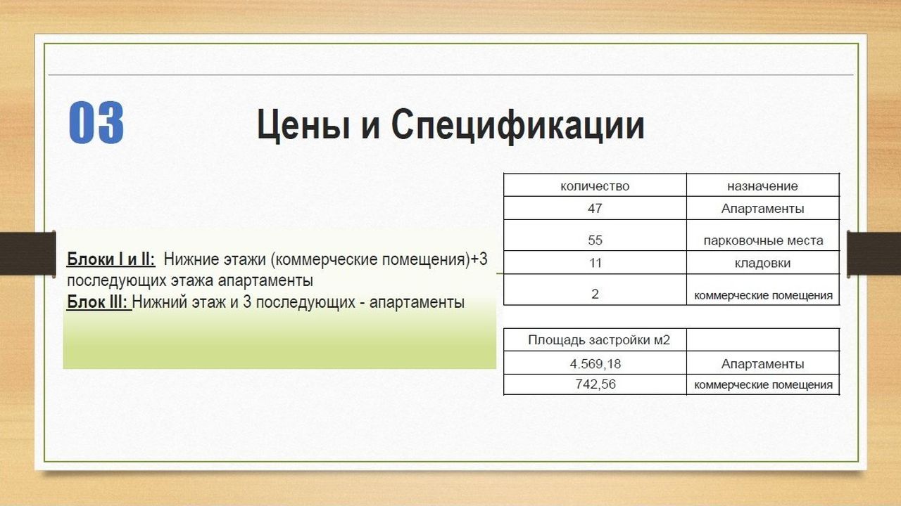 Проект состоит из 3 жилых блоков по 19 апартаментов в каждом (всего 47) с 2 и 3 спальнями и 3 коммерческих помещений на нижних этажах каждого блока, которые можно использовать