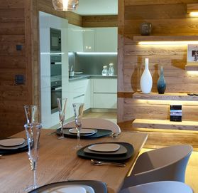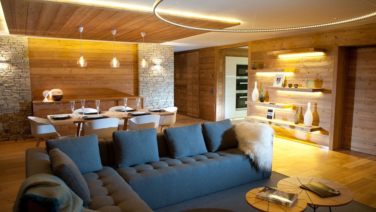 В отделке сочетается современный и альпийский стиль, использованы натуральные материалы: дуб, лиственница, камень. Из окон открываются прекрасные виды на долину Рона.