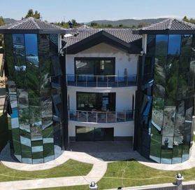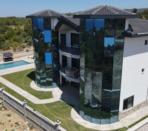 Силиконовый фасад комфорт стекла. Лестницы из мрамора и гранита (двойной цвет.) Кремовая крыша. Дополнительная изоляция (пожарная, тепло- и холодно-устойчивая.) Камин на одном этаже (под заказ с лифтом и параллельное открытие)