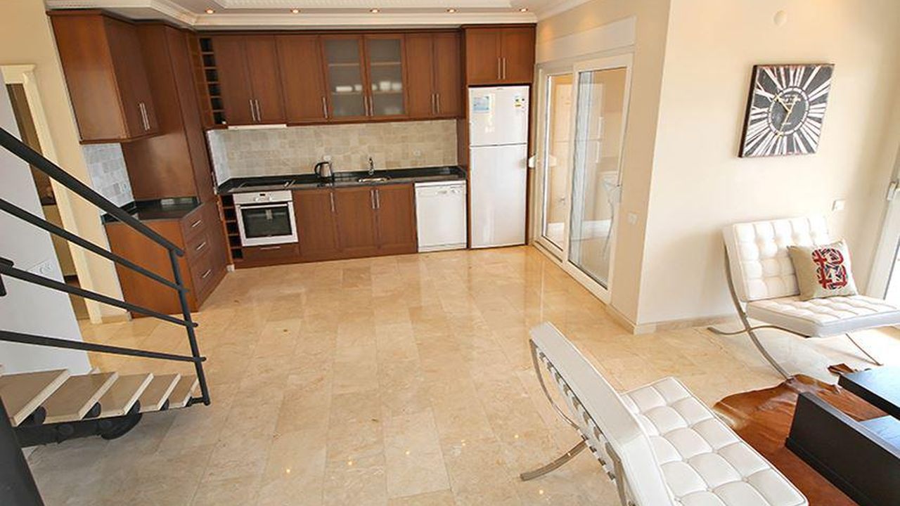 Планировка: гостиная совмещенная с кухней, три спальни, два санузла, кладовка, два больших балкона с красивой панорамой на горы, море и город Аланью. До центра и береговой линии 4 км. Каждые 30 мин, рядом проходит муниципальный автобус.