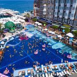Протяженность пляжа — 90 метров. Деревянный пирс, длина 60 метров. Пляжные полотенца выдаются по карточкам. На пляже: бар, шатры.
