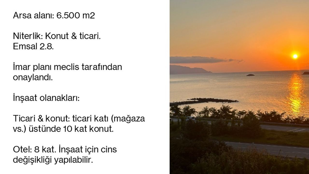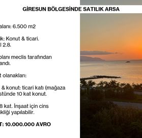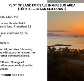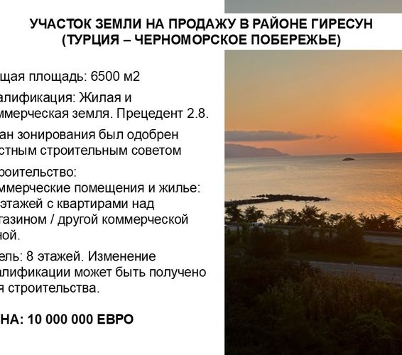 Турция. ПРОДАЕТСЯ ЗЕМЕЛЬНЫЙ УЧАСТОК В РАЙОНЕ ГИРЕСУН (ТУРЦИЯ - ПОБЕРЕЖЬЕ ЧЕРНОГО МОРЯ) Общая площадь: 6.500 м2 Квалификация: Земельные участки под жилую и коммерческую недвижимость. Прецедент 2.8. План зонирования утвержден советом. Строительство: Коммерческие помещения и жилье: 10 этажей с апартаментами над магазином / другой коммерческой зоной. Отель: 8 этажей. Для строительства может быть изменена квалификация. ЦЕНА: 10.000.000 евро Продадим вашу квартиру или дом. Есть выбор квартир и домов в различном бюджете, в том числе и коммерческие объекты