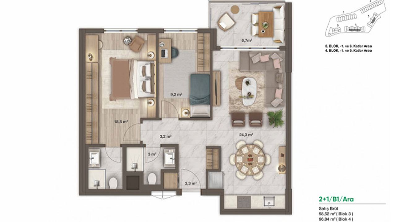 Проект расположенный на площади 23.000 м2, где 70% занимает зеленая территория, комплекс состоит из 5-и жилых блоков, всего 544 квартиры различной планировки от 2+1 до 5+1, площадью от 96 м2 до 267 м2.