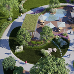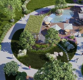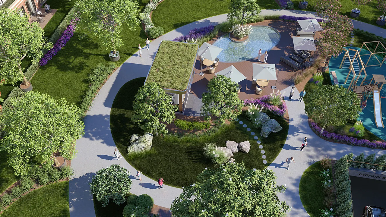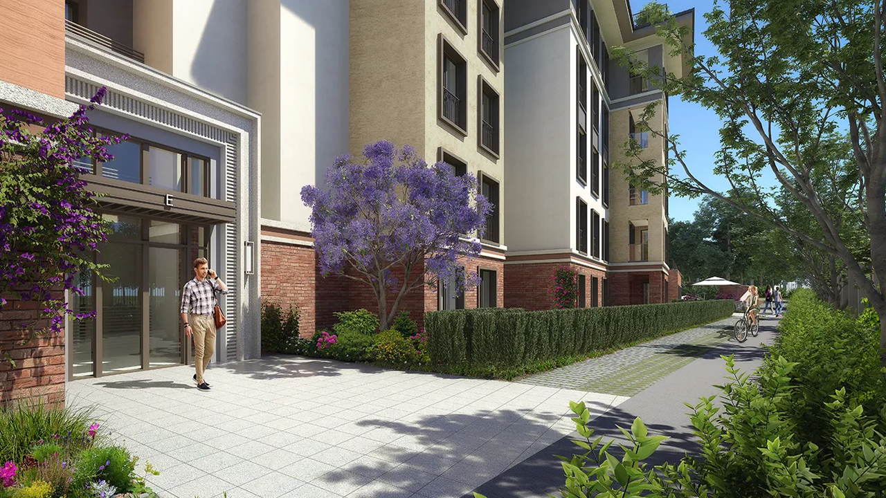 Территория комплекса будет закрытой и круглосуточно охраняемой. Вокруг жилых корпусов разобьют сад. В центральной части предусмотрены места для отдыха и барбекю, детская площадка, зоны фитнеса и йоги. Около въезда будут открытые парковки и спортивная площадка, на краю участка между домами — бассейн с шезлонгами. На первом этаже откроется тренажёрный зал.