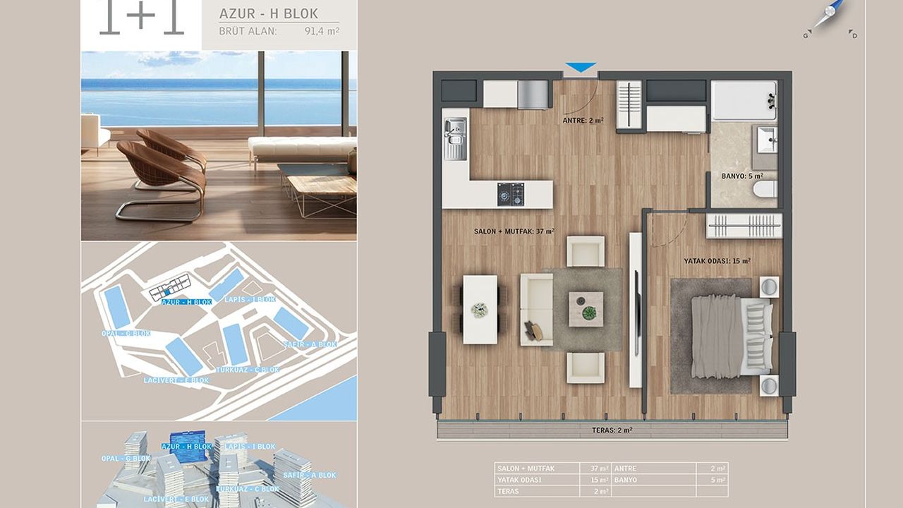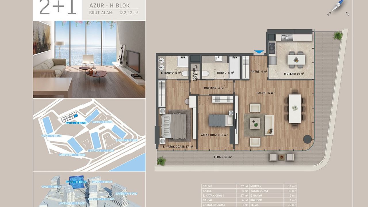 Комплекс занимает обширную территорию в 63 500 м2 из которых 51 500 м2 зелени с потрясающими видами на море. Включая шесть жилых блоков и один гостиничный, он обеспечивает уединение благодаря расстоянию между зданиями в 130 метров. Готовое свидетельство о праве собственности делает приобретение этого жилья еще более привлекательным.