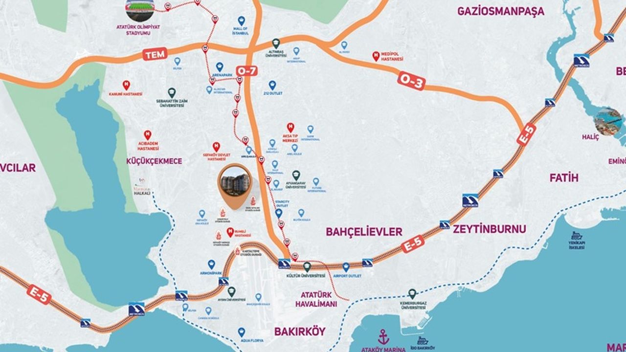 Комплекс расположен практически на стыке трех районов, Кучукчекмедже, Бахчелиевлер, Бакыркей, бизнес районом Basın Ekspres, в 5 минутах езды от Метробусной линии главной магистрали Е5 и ТЕМ.