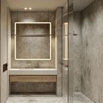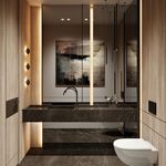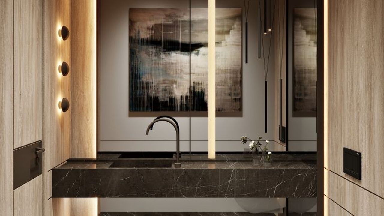 В апартаментах также есть дизайнерские ванные комнаты, оформленные в современном стиле.