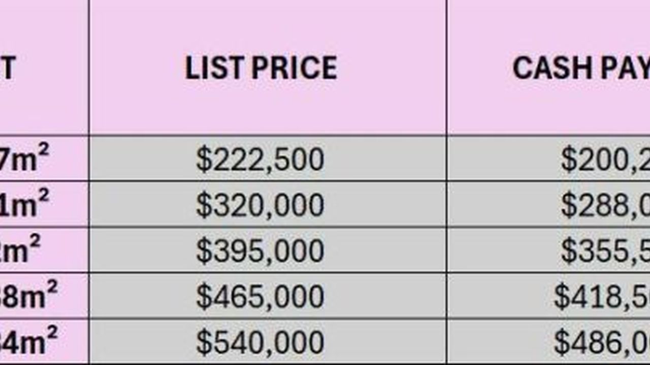 Цены от 64,92м2-200 250 долларов до 167м2 и 486 000 долларов.