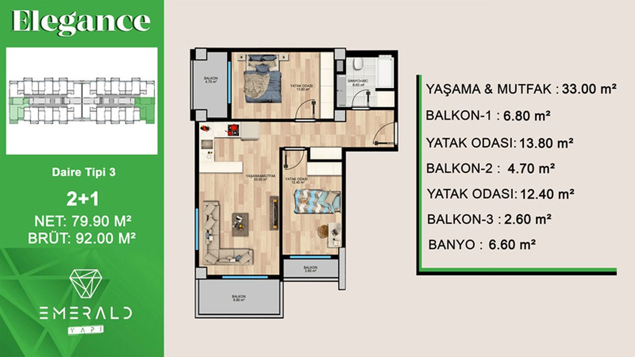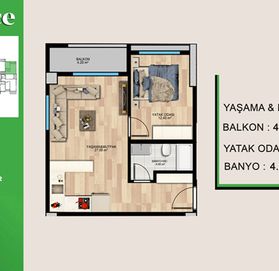 Комплекс расположен на площади 3.911 м2 состоит из двух блока, в продаже квартиры 1+1 и 2+1, площадью от 53 м2 до 92 м2.