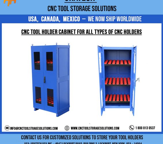 Uratech designs and manufactures tool cabinet to store all types of CNC holders, made from 11-gauge powder-coated steel with welded construction, ready to use, and available for shipping.